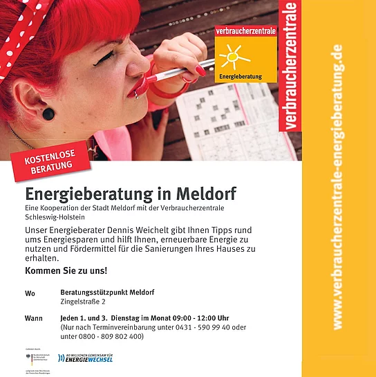 Eine Kooperation der Stadt Meldorf mit der Verbraucherzentrale Schleswig-Holstein. KOMMEN SIE ZU UNS! An jedem 1. + 3. Dienstag im Monat gibt unser Energieberater Dennis Weichelt Ihnen Tipps rund ums Energiesparen und hilft Ihnen, erneuerbare Energie zu nutzen und Fördermittel für die Sanierungen Ihres Hauses zu erhalten. (Nur nach Terminvereinbarung unter 0431 - 590 99 40 oder 0800 - 809 802 400)