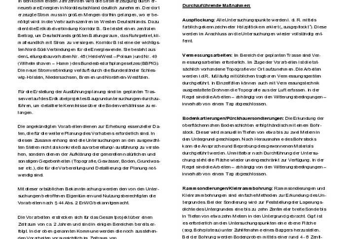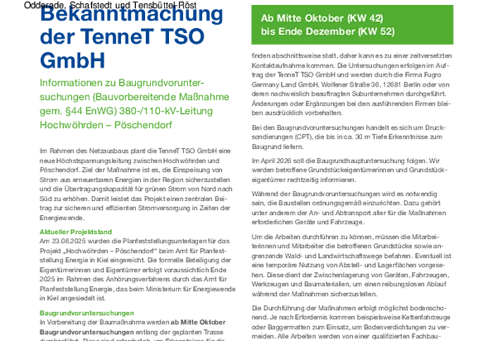 Bekanntmachung der TenneT TSO GmbH - Informationen zu Baugrundvoruntersuchungen (Bauvorbereitende Maßnahme gem. § 44 EnWG) 380-/110-kV-Leitung Hochwöhrden - Pöschendorf