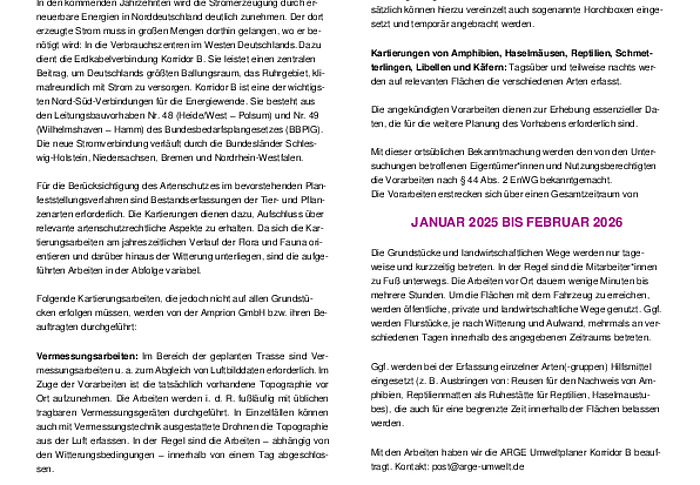 Amprion GmbH: Ankündigung von Kartierungsarbeiten für die Trassenplanung - Ortsübliche Bekanntmachung im Bereich der Gemeinde Nordermeldorf - Erdkabelverbindung Korridor B