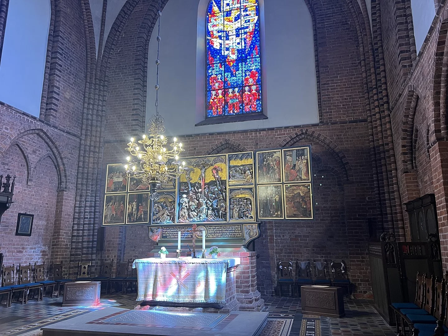 Neugierig und ein wenig schüchtern nähern Besucher sich der geschlossen Chorschranke und lugen durch das Gitter auf den Passionsaltar mit seinen farbenprächtigen und vergoldeten Figuren. Er entstand ca. 1520 noch vor der Reformationszeit. Aber auch wenn die Türflügel des Chorgitters geöffnet sind, bleibt dieser Bereich etwas Besonderes, ein Raum, der eben noch etwas heiliger ist als der Rest der Kirche. Dazu trägt sicherlich auch das Fenster hinter dem Altar bei, dessen farbiges Licht dem Altarraum seine inspirierende Atmosphäre verleiht. Anfang der 1960er Jahre gestaltete der Maler und Bildhauer Siegfried Assmann aus Groß-Hansdorf bei Hamburg dieses und weitere Fenster des Doms.