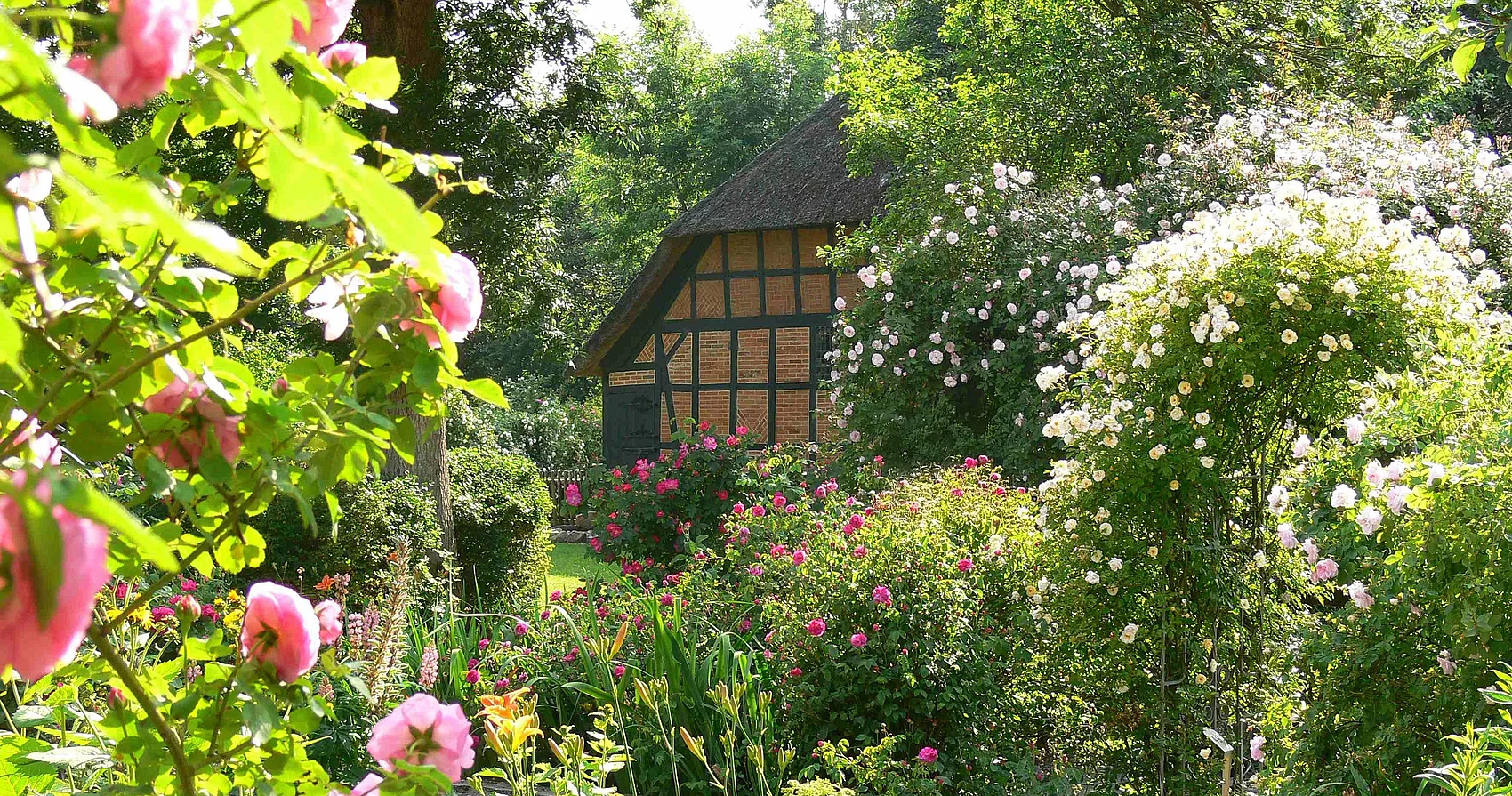Der Weg vom Schleswig-Holsteinischen Landwirtschaftmuseum zum Dithmarscher Bauernhaus führt durch den Rosengarten mit seiner Sammlung Alter Rosen.